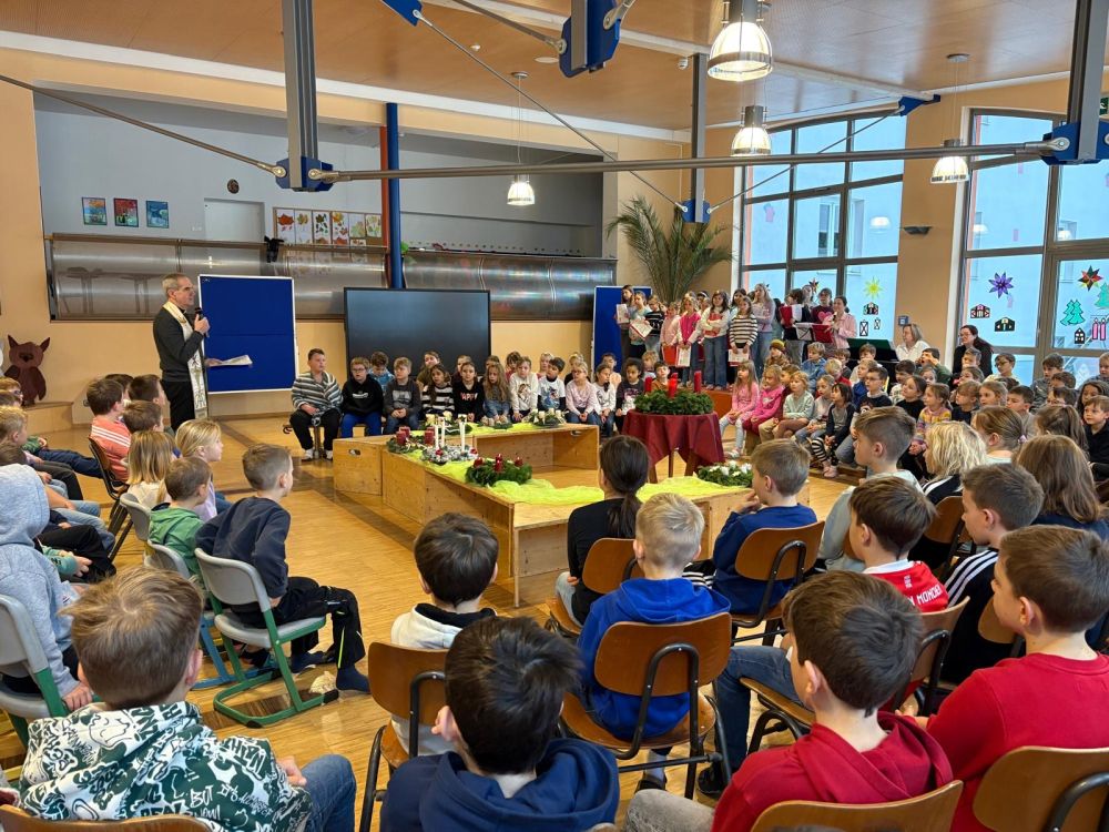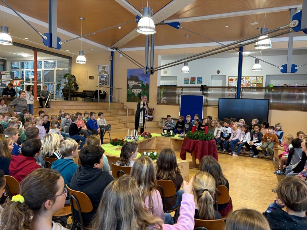 Stadtpfarrer Magnus König erzählte uns anschließend eine kurze Geschichte, welche auch zum Nachdenken anregen soll. Wie kann ich die Zeit des Wartens auf die Ankunft von Gottes Sohn besonders nutzen? Was ist für uns Menschen wirklich wichtig? Das Wertvolle dieser besonderen Zeit ist das Zusammenkommen, Gespräche und auch, Licht in die Welt zu tragen. Mit dem gemeinsamen Lied „ Kinder tragen Licht in´s Dunkel“ machten wir uns alle auf den Weg, Hoffnung, Freude und auch Frieden in die Welt zu bringen. Nach der Segnung der Adventskränze schlossen wir die Feier mit dem „Vater unser“ und dem Schlusslied „Advent is a Leuchten“, welches wunderschön vom Chor unter der Leitung von Frau Andrea Frauenauer, vorgetragen wurde.