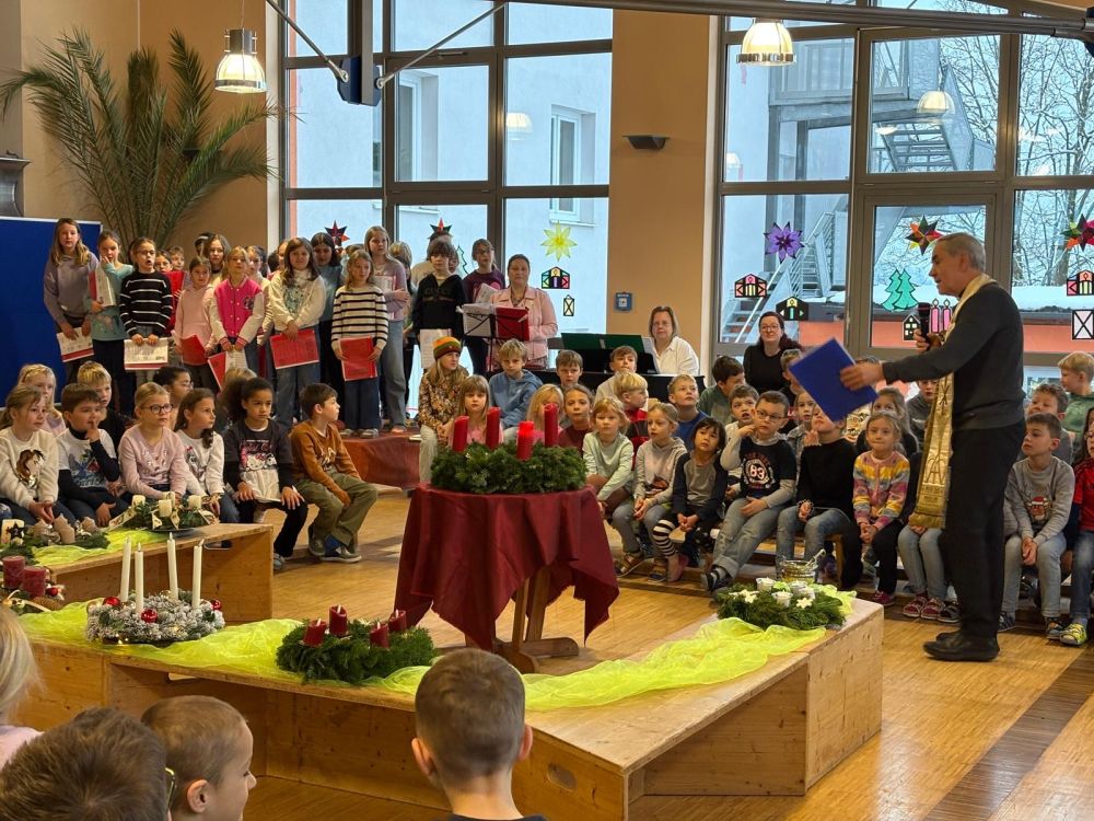 Stadtpfarrer Magnus König erzählte uns anschließend eine kurze Geschichte, welche auch zum Nachdenken anregen soll. Wie kann ich die Zeit des Wartens auf die Ankunft von Gottes Sohn besonders nutzen? Was ist für uns Menschen wirklich wichtig? Das Wertvolle dieser besonderen Zeit ist das Zusammenkommen, Gespräche und auch, Licht in die Welt zu tragen. Mit dem gemeinsamen Lied „ Kinder tragen Licht in´s Dunkel“ machten wir uns alle auf den Weg, Hoffnung, Freude und auch Frieden in die Welt zu bringen. Nach der Segnung der Adventskränze schlossen wir die Feier mit dem „Vater unser“ und dem Schlusslied „Advent is a Leuchten“, welches wunderschön vom Chor unter der Leitung von Frau Andrea Frauenauer, vorgetragen wurde.