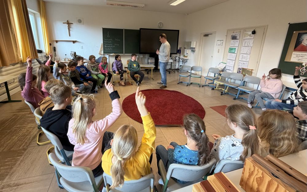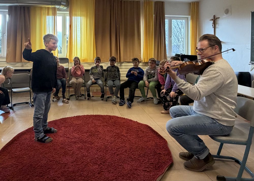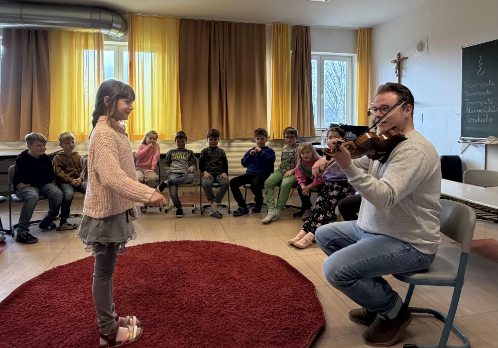 Den Höhepunkt seines Besuches bildete das gemeinsame, schwungvolle Singen der Lieder "Grün, grün, grün" und "Ich lieb das Singen", das von ihm auf seiner Violine begleitet wurde.