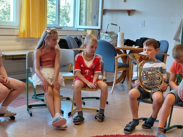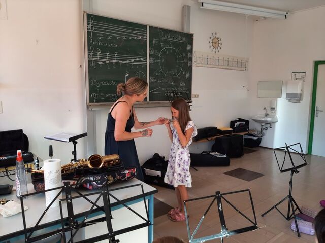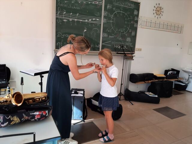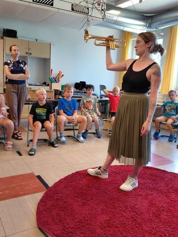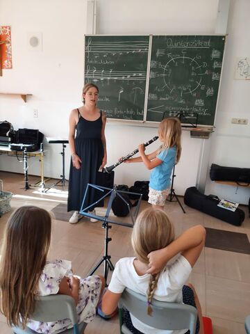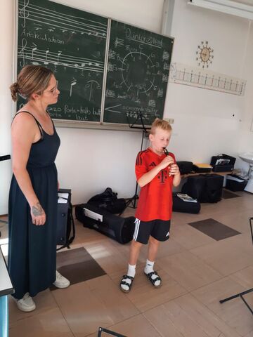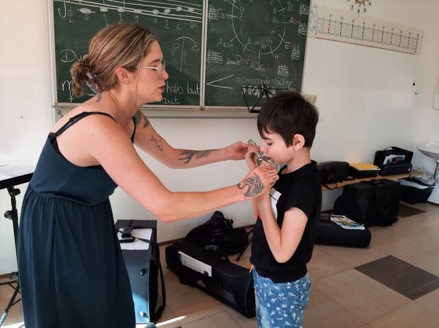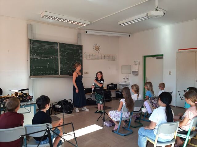 Die Klasse 2b bereitet sich schon auf das nächste Schuljahr vor und lernt die Bläserklasse kennen. Herr Frantisek und Frau Gutsmiedl stellten dazu die möglichen Instrumente vor. Großen Spaß machte es, diese selbst auszuprobieren.