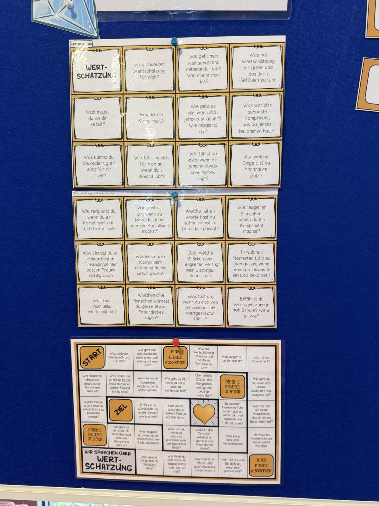 Zum Schluss ihres Vortrages wiesen die Kinder uns auf ein „Wertschätzungs- Spiel“ hin, welches an ihrer Klassenzimmertür hängt und zum Spielen und Ausprobieren einladen soll.