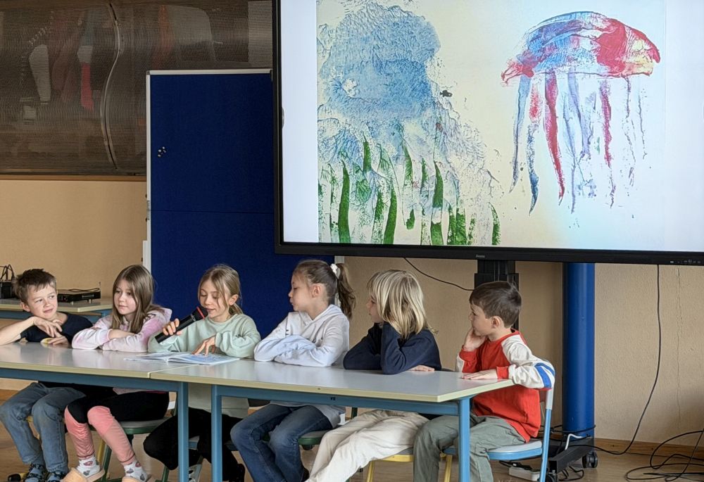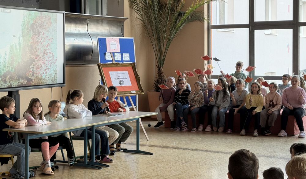Heute stellte uns die Klasse 3a mit Frau Bauer den Wert "Zusammenhalt" vor. Auf der Basis des Buches "Swimmy" von Leo Lionni machten die Kinder darauf aufmerksam, auf was es beim Zusammenhalten ankommt, und was gemeinsam bewirkt werden kann.