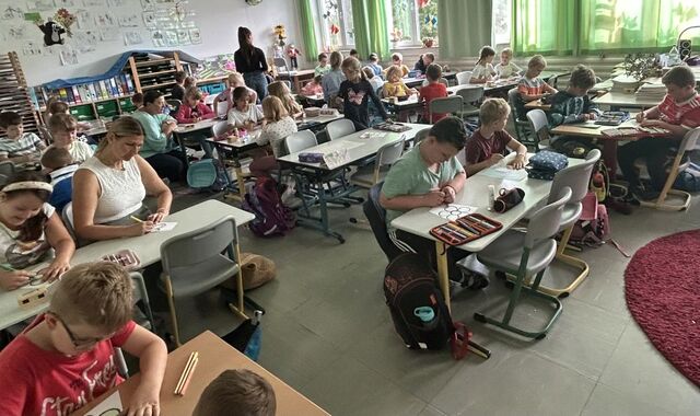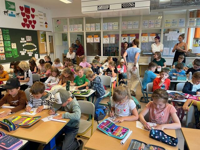 Voller Freude begrüßten die 1. Klassen die Schulanfängerkinder in der Aula. Schnell hatte jeder Erstklässler/ jede Erstklässlerin seinem/ ihrem Patenkind einen persönlichen Brief überreicht. Anschließend ging es in´s Klassenzimmer, wo fleißig gemalt, ausgeschnitten, geklebt und sich gegenseitig geholfen wurde.