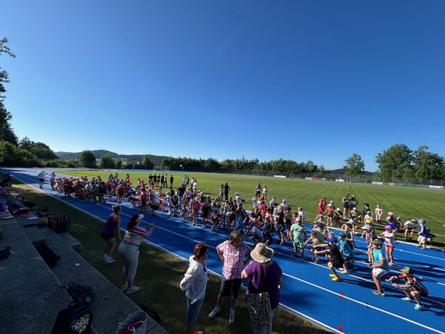 Bei strahlendem Sonnenschein machte sich die gesamte Grundschulgemeinschaft auf den Weg zum Sportplatz. Nach dem Aufwärmsong "Sportinator"- vorgeturnt von der Klasse 3b- verteilten sich die Kinder an die jeweiligen Stationen. Begleitet von AchtklässlerInnen aus der Mittelschule Freyung als RiegenführerInnen zeigten die SchülerInnen ihr Können in den Disziplinen Werfen, Laufen und Springen. Der Elternbeirat hielt leckeres Obst für die jungen SportlerInnen bereit.